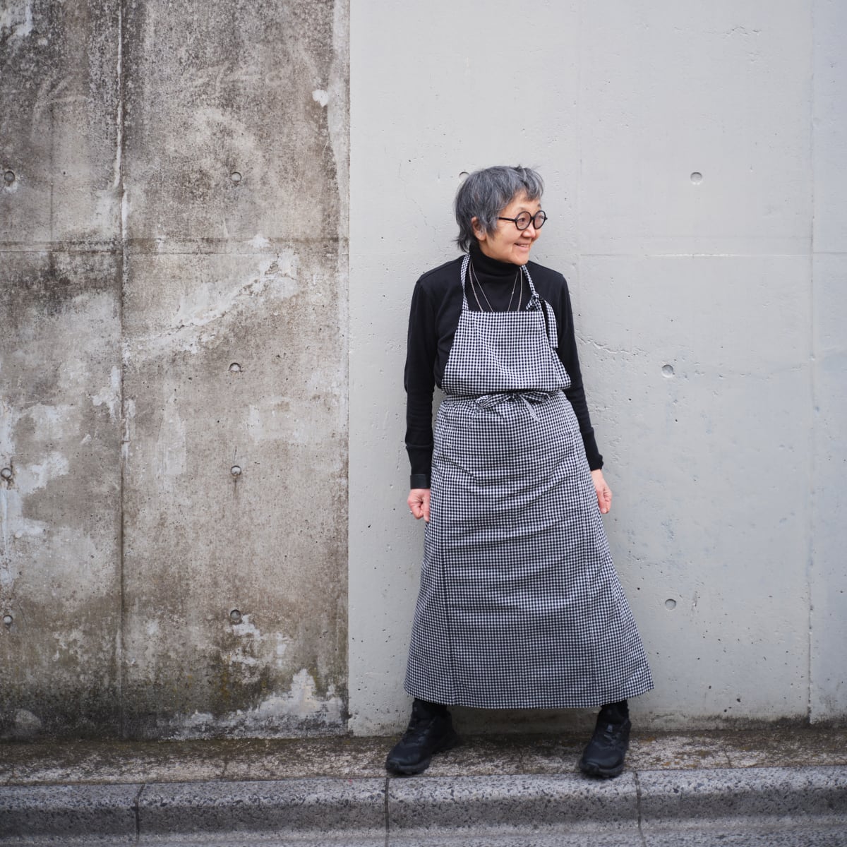 Even though it's just a piece of cloth, when you put it on, you suddenly feel more motivated. An apron that adult women would want to wear all day long. I am excitedly making such an apron. Among my favorite Liberty prints, I chose a monochrome plaid pattern for the square apron. Because of its large size, it feels like it's completely wrapped up in you. You can also browse around your waist. Men are welcome too! We also have button-type kappou-gi with the same pattern.