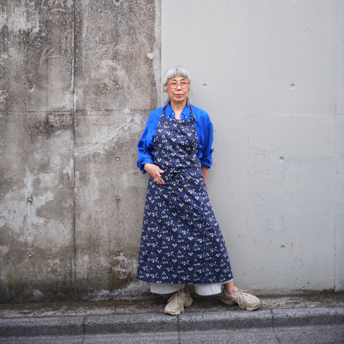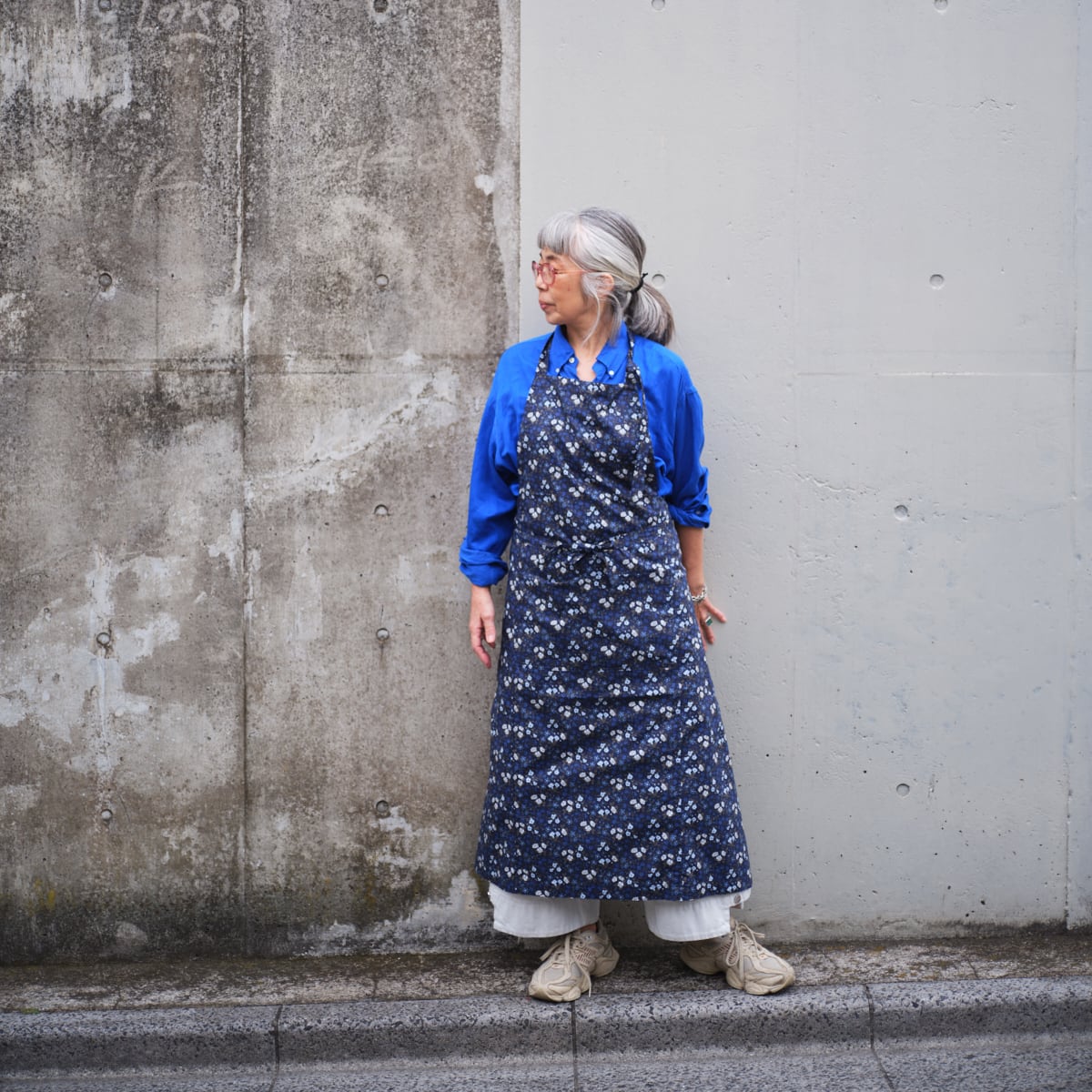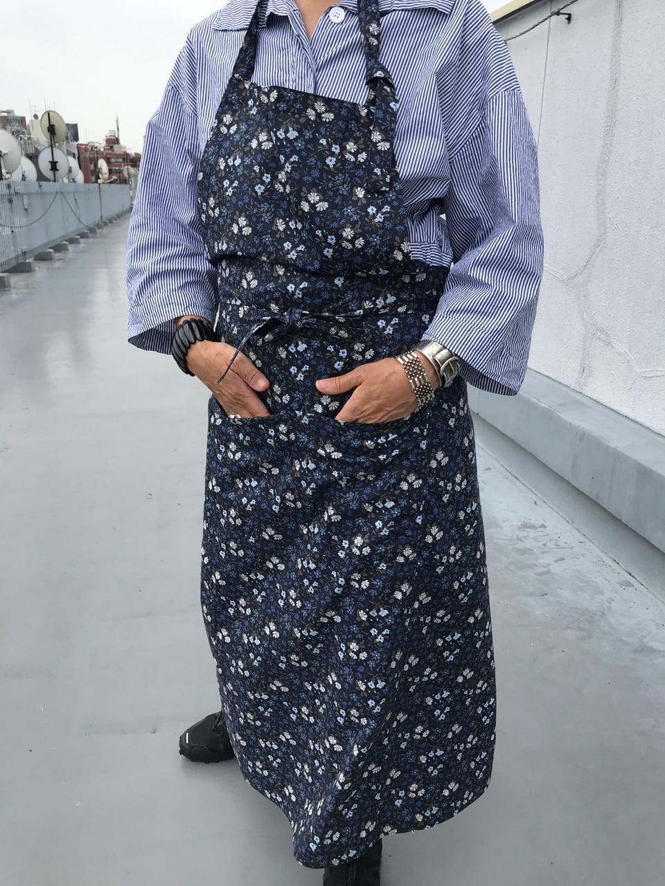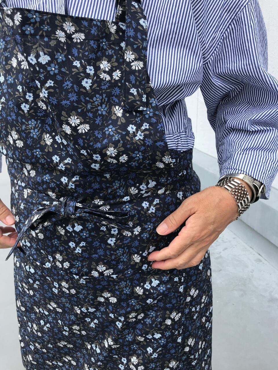 大好きなリバティプリントの中からスクエアエプロンに選んだのは、ブルーのマリア柄。