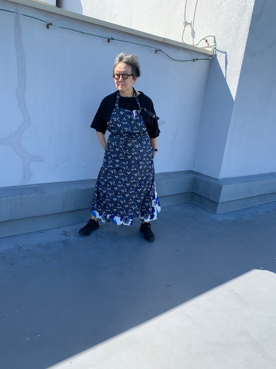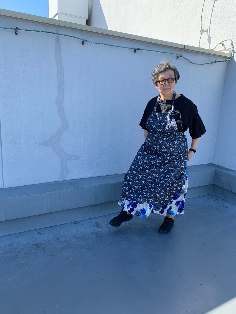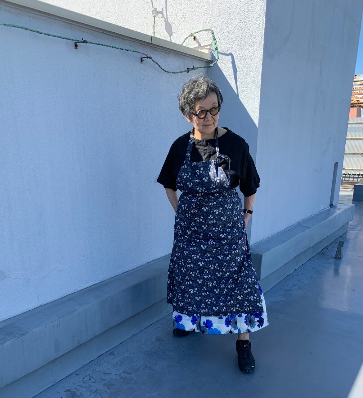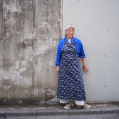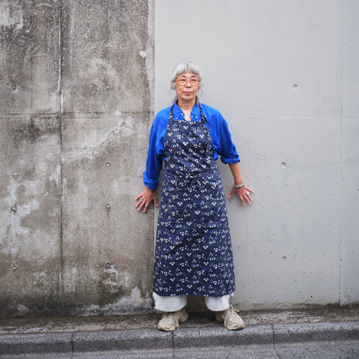 大好きなリバティプリントの中からスクエアエプロンに選んだのは、ブルーのマリア柄。